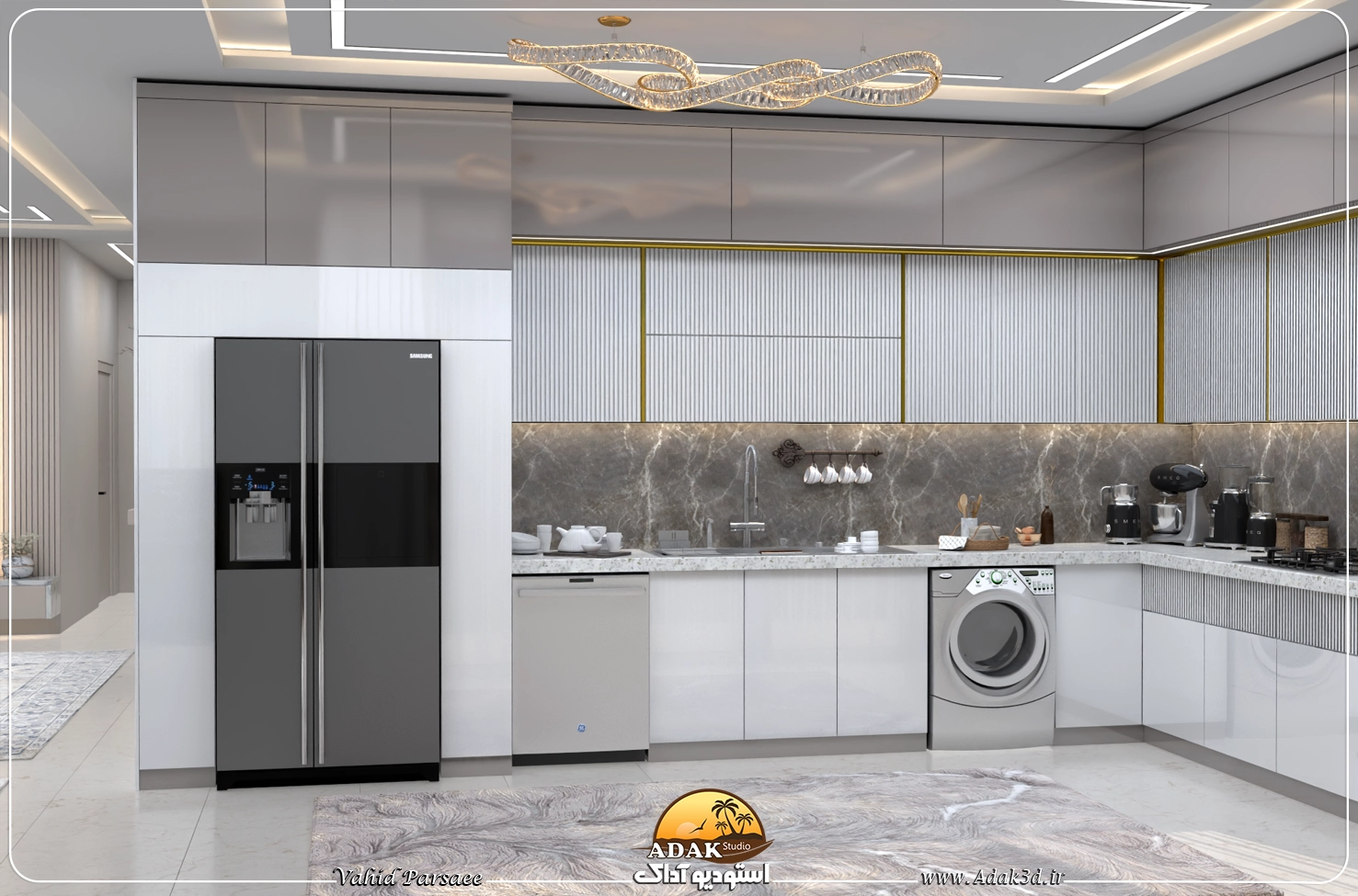 این طراحی سهبعدی یک آشپزخانه مدرن است که بهطور خاص با کابینتهای طرح شکسته، متریال سفید، و چوب با طرح سنگ روشن اجرا شده است. در این طرح، جزیرهای ساده بهعنوان نقطه کانونی طراحی در نظر گرفته شده که علاوه بر زیبایی، کارایی فضا را افزایش میدهد. استفاده از ترکیبات متریالهای روشن، حس فضایی باز و دلنشین را ایجاد کرده و در کنار نورپردازی هوشمندانه، جزئیات زیبا و خاص این طراحی را برجسته میسازد.