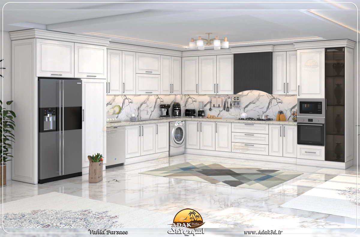 این پروژه طراحی سه‌بعدی آشپزخانه‌ای نئوکلاسیک است که در آن، هنر سنتی و سادگی مدرن به زیبایی با یکدیگر ترکیب شده‌اند. استفاده از متریال سفید و مشکی در کنار چوب ترمو، جلوه‌ای بی‌نظیر از تضاد رنگ‌ها و گرمای طبیعی را به فضا بخشیده است.