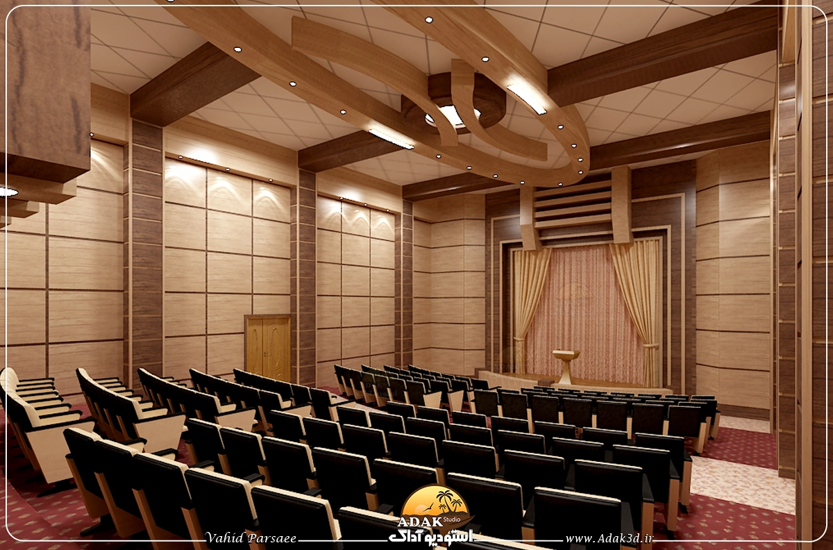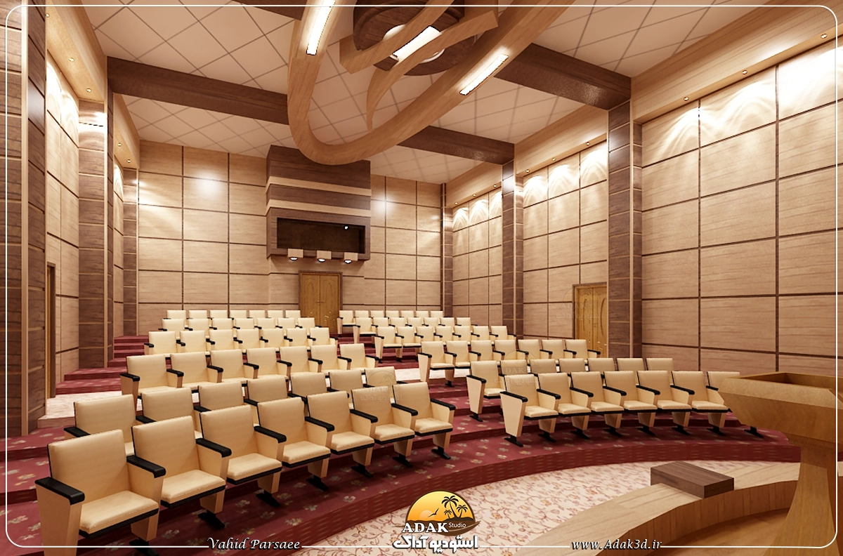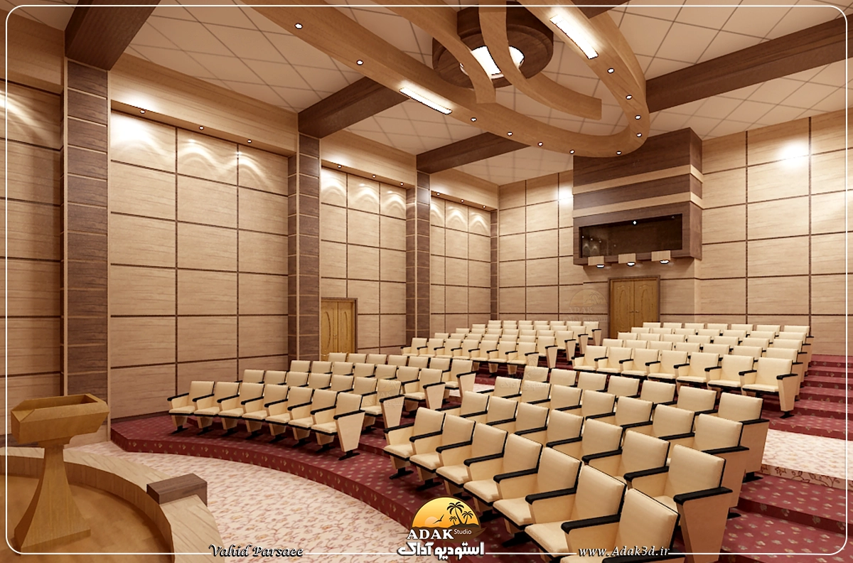 طراحی سه‌بعدی سالن کنفرانس با ام‌دی‌اف‌های گردویی و کرم، فضایی هماهنگ و جذاب را ایجاد می‌کند. رنگ‌های گردویی برای حس گرم و رسمی استفاده می‌شوند، در حالی که رنگ کرم موجب روشن‌تر شدن محیط و تعادل بصری می‌شود. در این طراحی، دیوارها، میزها، و دیگر مبلمان اصلی از ام‌دی‌اف گردویی ساخته می‌شوند، و کرم در تزئینات جزئی و صندلی‌ها به کار می‌رود.