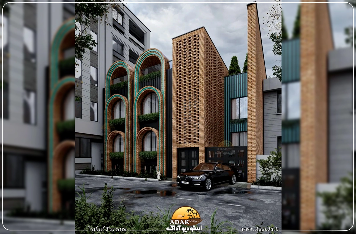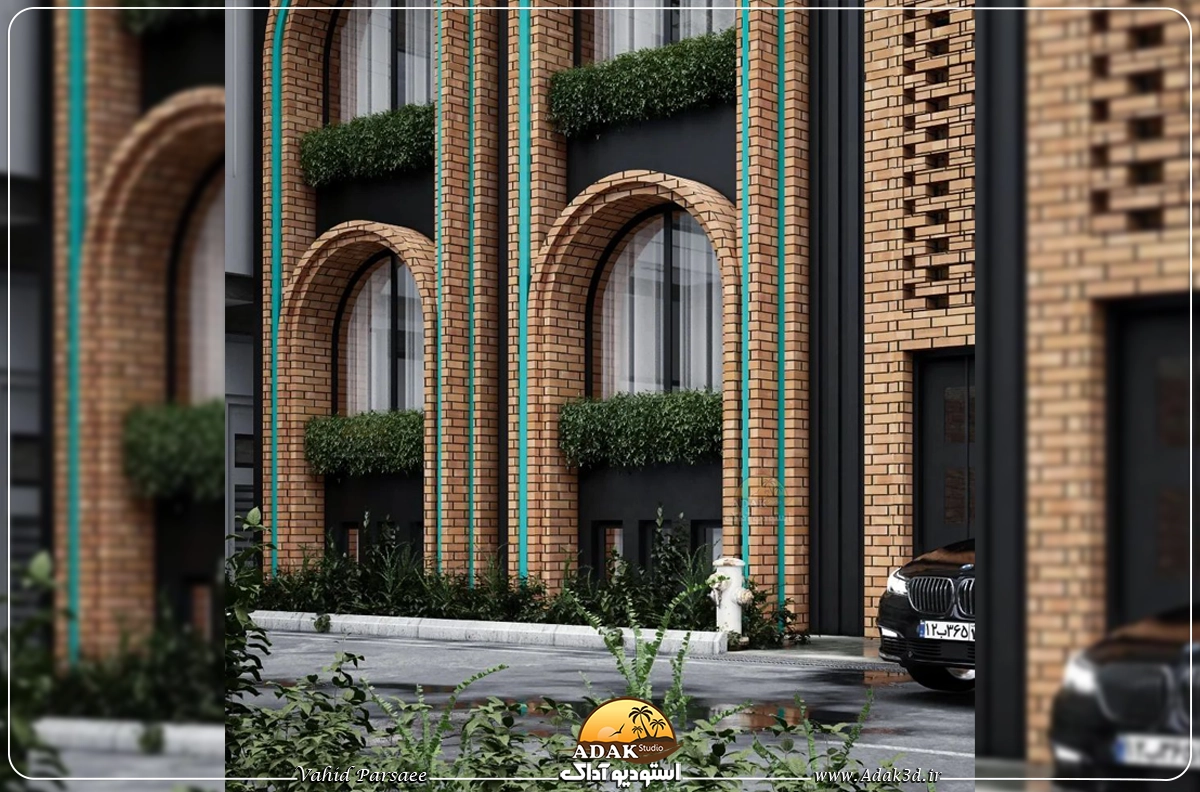 طراحی نمای سهبعدی با ترکیب آجر و سنگ فیروزهای، جلوهای کلاسیک و الهامگرفته از معماری اسلامی دارد. این سبک با استفاده از پنجرههای گنبدی، حس زیباییشناسی سنتی را تقویت کرده و هماهنگی بصری میان عناصر مختلف را به نمایش میگذارد.