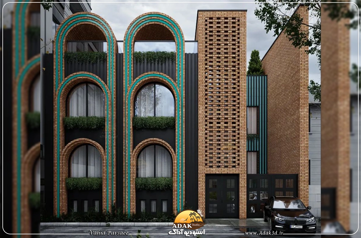 در این طرح، نمای سهطبقه با استفاده از آجرهای گرم و سنگهای فیروزهای، ترکیب رنگی منحصر به فردی ایجاد میکند که حس شکوه و اصالت را به ساختمان میبخشد. پنجرههای گنبدی با انحناهای ظریف، علاوه بر زیبایی، نورگیری مناسبی برای فضای داخلی فراهم میکنند. بهکارگیری تزئینات ظریف و الگوهای هندسی در جزئیات نما، هویت معماری اسلامی را برجسته کرده و حس هماهنگی و توازن را در کل ساختار ایجاد میکند.