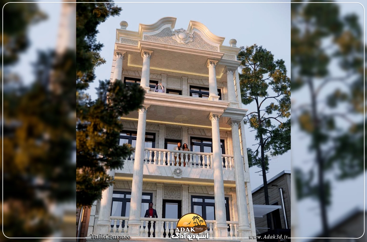 نمای ساختمان به سبک کلاسیک جهت شمالی، ترکیبی از شکوه تاریخی و ظرافت مدرن است. تراسهای بزرگ با طراحی موزون، فضایی دلباز و کاربردی را فراهم میکنند که به تعامل با محیط پیرامون کمک میکند. ستونهای گرد با جزئیات ظریف گچبری و سنگکاری، حس استواری و شکوه را تقویت کرده و هماهنگی چشمنوازی را در ساختار بنا ایجاد میکنند. تاجهای بزرگ با نقشونگارهای برجسته، نقطه کانونی نما را شکل داده و به آن جلوهای فاخر و ماندگار میبخشند. انتخاب متریالهایی چون سنگ مرمر، تراورتن یا چوب طبیعی، همراه با نورپردازی هوشمند، هویت معماری کلاسیک را در این طرح تقویت میکند. بهرهگیری از پنجرههای بلند و متناسب با مقیاس ساختمان، ضمن ایجاد دید مناسب، به ورود نور طبیعی نیز کمک کرده و حس سرزندگی را افزایش میدهد. این طراحی، تلفیقی از هنر معماری سنتی و عملکرد مدرن را ارائه میدهد که هم از نظر زیباییشناسی و هم از نظر کارایی، مطلوب و چشمنواز خواهد بود.