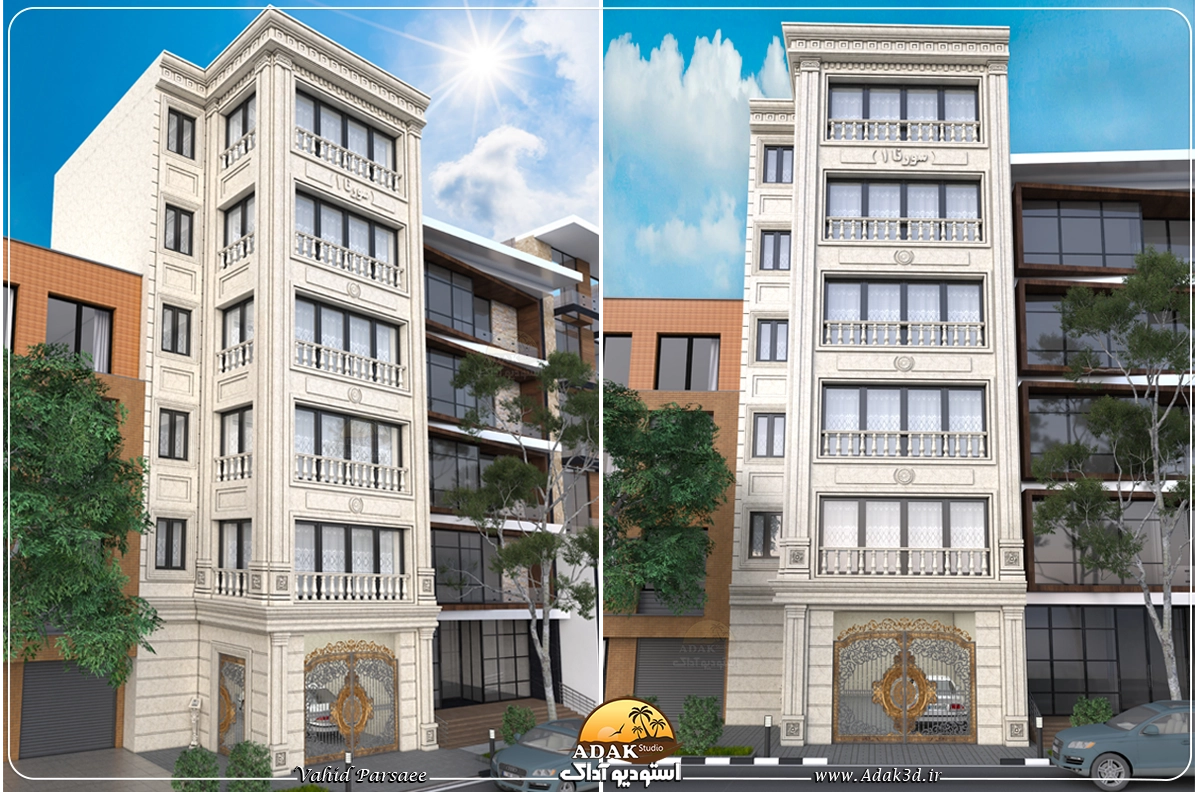 ساختمان چهار طبقه با نمای کلاسیک، تجلیگر معماری فاخر و اصالت بینظیر است. این طراحی، با استفاده از المانهای برجستهای مانند ستونهای رومی، سرستونهای هنرمندانه و تقارن بیعیب، هویتی باشکوه و ماندگار ایجاد کرده است. خطوط ظریف و استفاده از متریالهایی همچون سنگ طبیعی و تزئینات دستساز، حس اصالت و کلاس را به بنا بخشیده است.