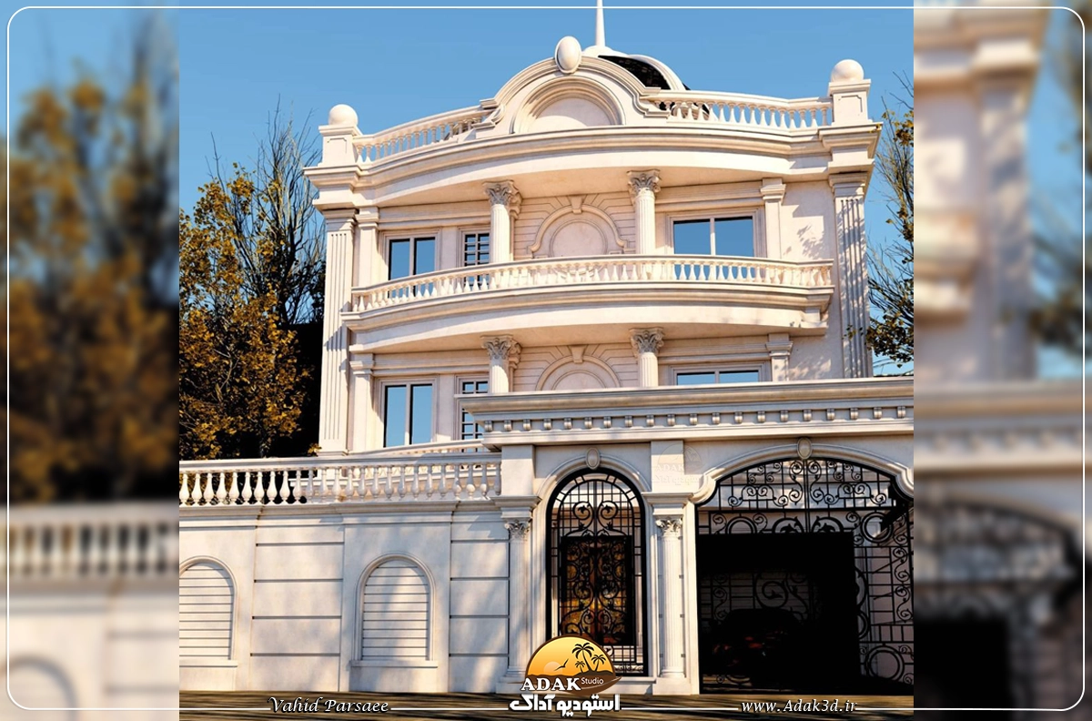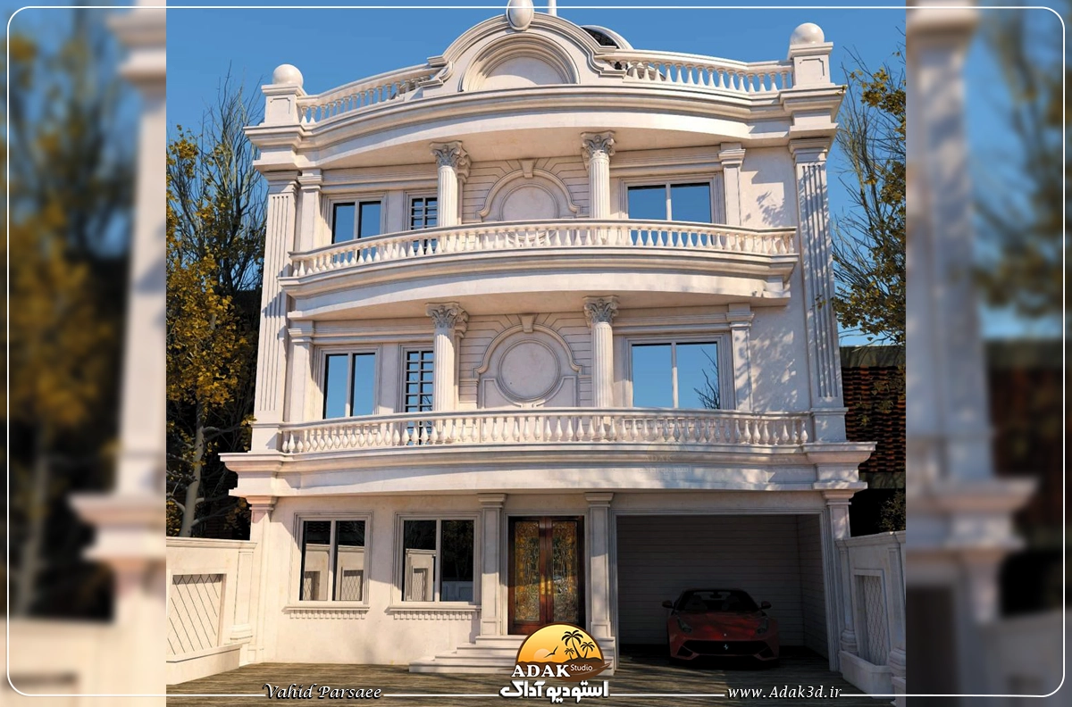 نمای کلاسیک ویلایی دو طبقه با تراس قوسدار و متریال سنگ روشن ترکیبی باشکوه از هنر معماری سنتی است. تراسهای قوسدار با خطوط نرم و منحنی، حس ظرافت و حرکت را در نما ایجاد میکنند، درحالیکه استفاده از سنگ روشن باعث القای حس گرما و لوکس بودن میشود. این سبک نمای جذاب و ماندگار، در کنار جزئیات برجسته و تزئینات کلاسیک، ساختمان را به اثری هنری تبدیل میکند که آرامش و استواری را به نمایش میگذارد.