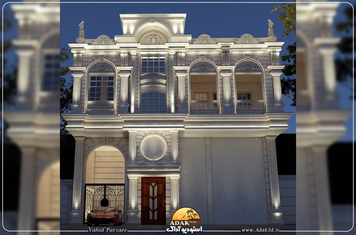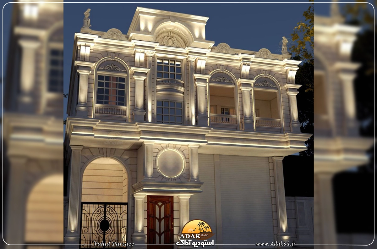طراحی سه بعدی نمای کلاسیک یک طبقه با همکف