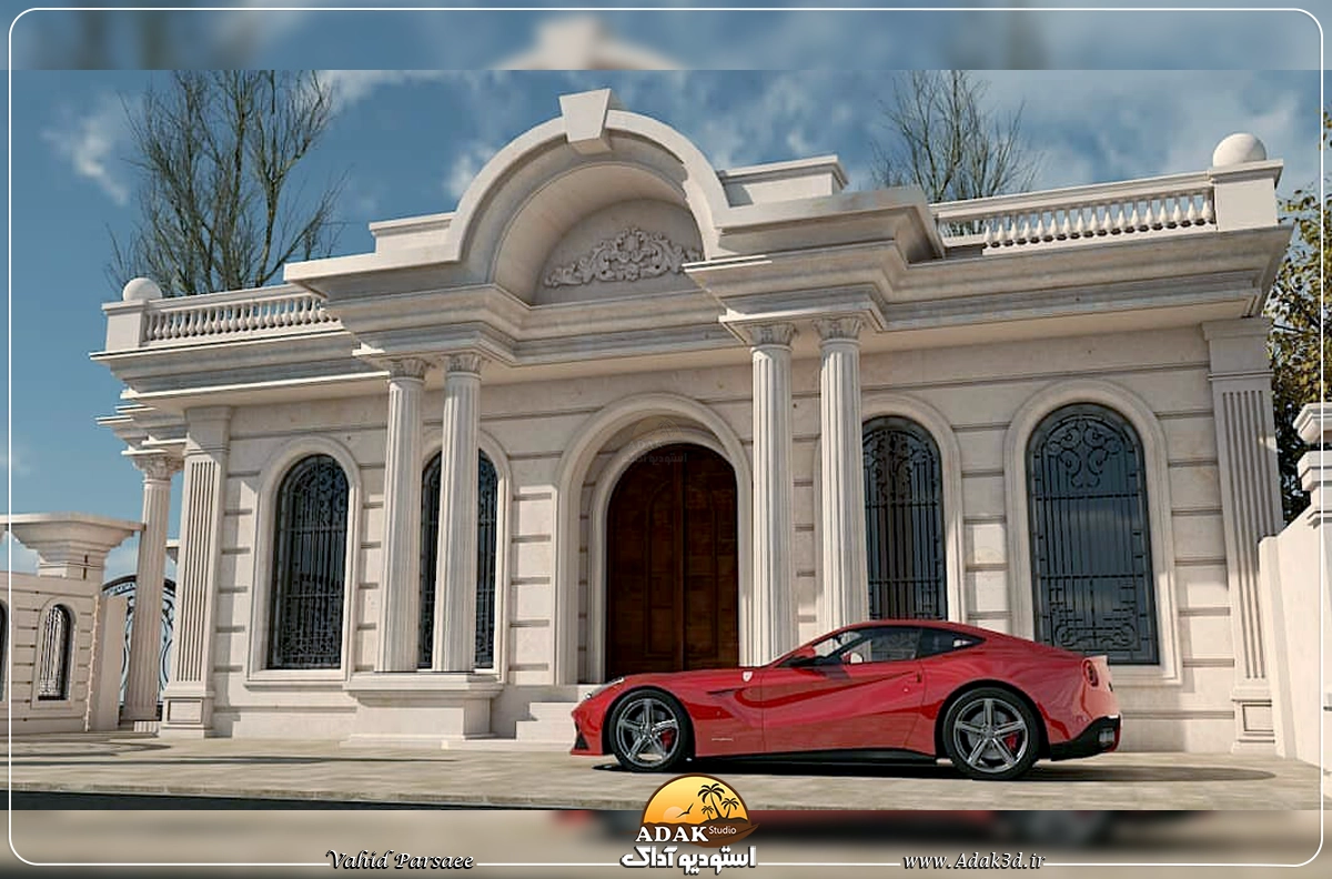 طراحی سه بعدی نمای ساختمان کلاسیک ویلایی یک طبقه